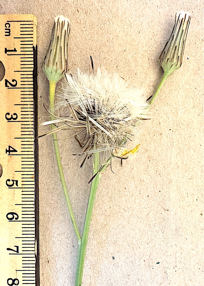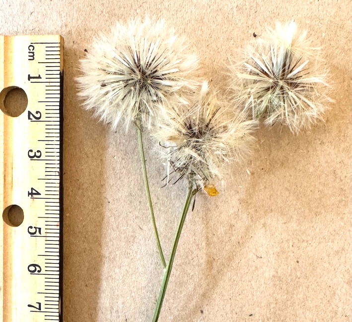 Almeirão-do-Campo (Hypochaeris radicata L.) — detalhe das estruturas reprodutivas, mostrando capítulos em diferentes estágios: botões florais com invólucro alongado, capítulo frutificado com aquênios providos de pápus branco (dispersão anemocórica) e pedúnculos finos e ramificados. Espécie herbácea da família Asteraceae, comum em campos e áreas abertas. Escala em centímetros.