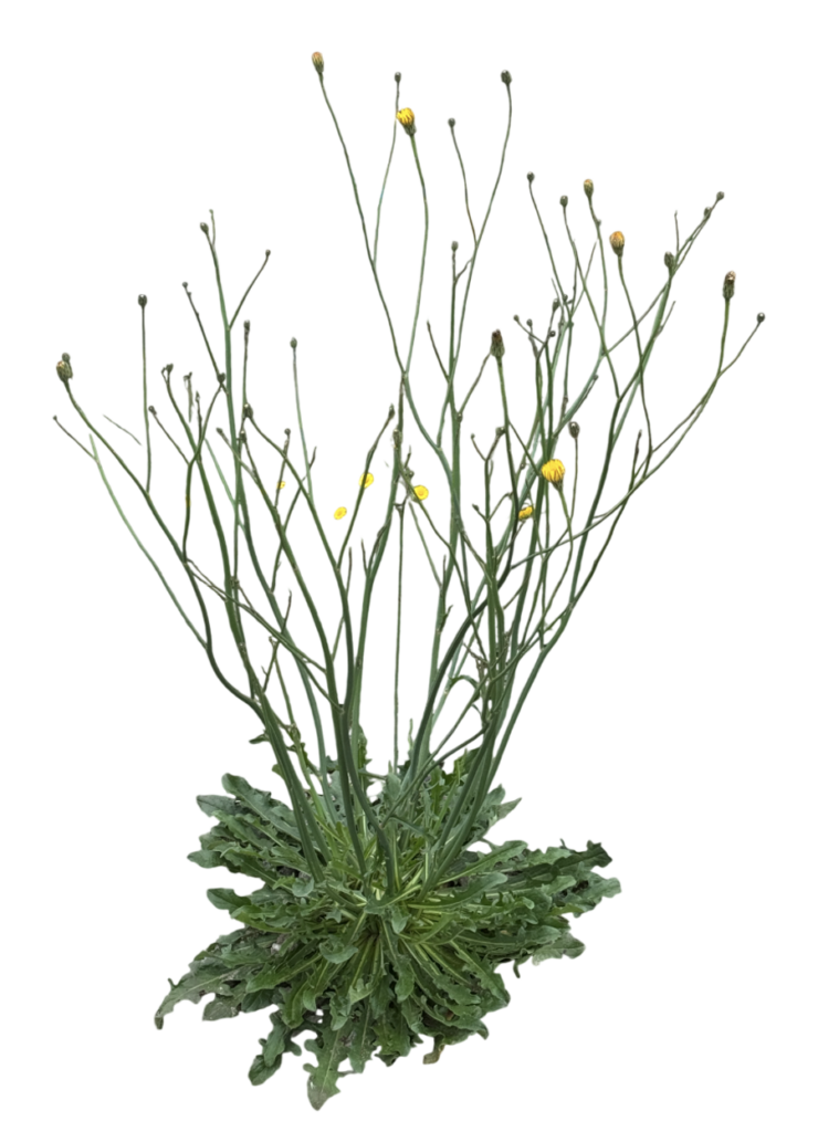 Almeirão-do-Campo (Hypochaeris radicata L.) — planta herbácea da família Asteraceae, caracterizada pela roseta basal de folhas profundamente lobadas e pelas hastes florais longas, finas e ramificadas, portando numerosos capítulos amarelos em diferentes estágios de desenvolvimento. Espécie comum em campos, pastagens e áreas abertas, especialmente em solos pobres e pedregosos, frequentemente confundida com o dente-de-leão verdadeiro (Taraxacum officinale).