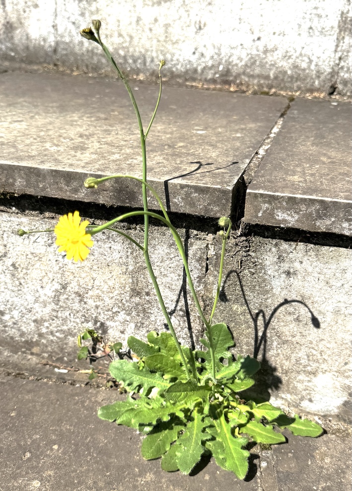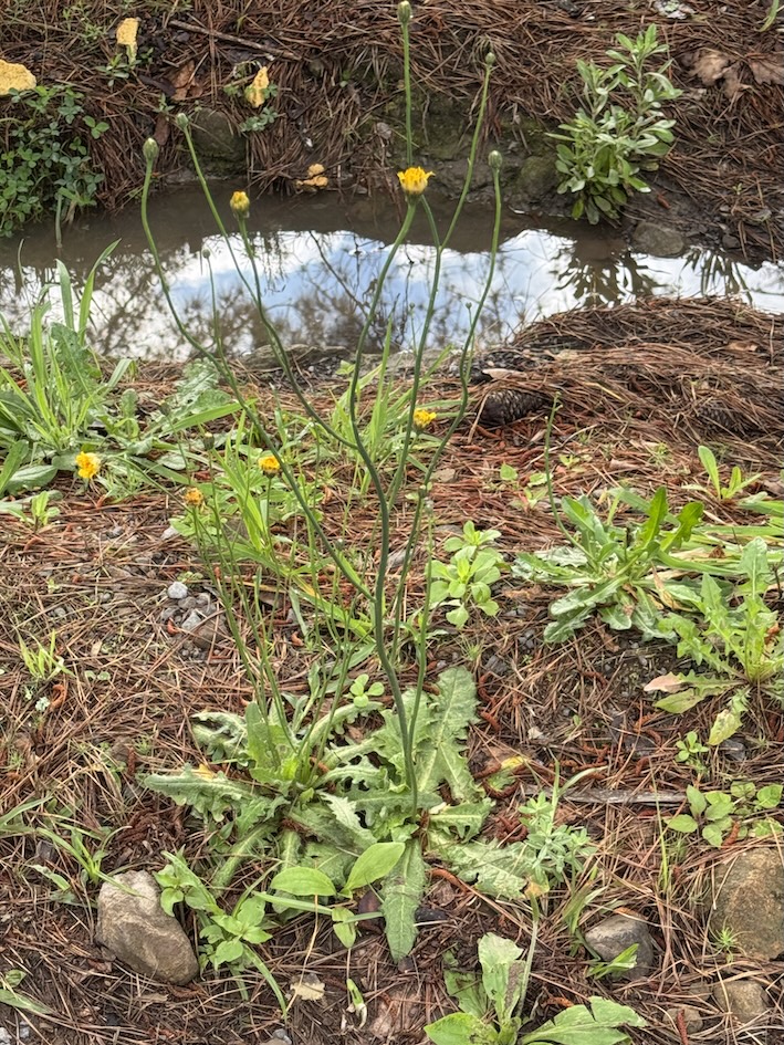 Almeirão-do-Campo (Hypochaeris radicata L.) — planta herbácea da família Asteraceae crescendo em ambiente urbano, com roseta basal de folhas lobadas e ásperas e hastes florais longas, delgadas e ramificadas, portando capítulos amarelos solitários ou em pequeno número. Espécie rústica e altamente adaptável, comum em frestas de calçadas, beiras de estrada e áreas perturbadas (Canela, RS; 29°19’22.7″S 50°46’26.8″W, 5.12.2025).