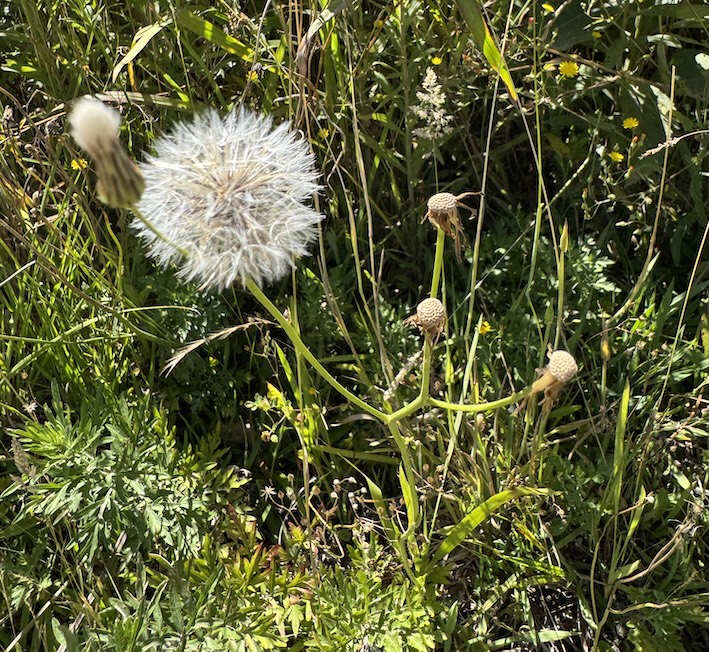 Almeirão-do-Campo (Hypochaeris radicata L.) — detalhe da fase de frutificação, com capítulo frutificado apresentando pápus branco bem desenvolvido e capítulos pós-floração ao longo de hastes finas e ramificadas. Espécie herbácea da família Asteraceae, comum em campos e áreas abertas, cuja dispersão dos aquênios ocorre principalmente pelo vento. Canela, RS, 29°20’08.7″S 50°47’07.5″W, 18.12.2025.